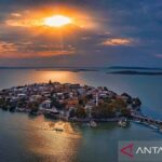 Foto dari udara yang diabadikan pada 21 September 2023 ini menunjukkan patung Dayu di Dayudu, wilayah Ruicheng, Kota Yuncheng, Provinsi Shanxi, China utara. (Xinhua/Yang Chenguang)