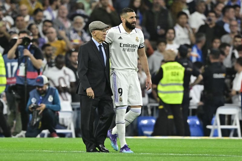 Karim Benzema dan mantan pemain timnas Spanyol Amancio Amaro jelang pertandingan La Liga antara Real Madrid dan Osasuna di Santiago Bernabeu, Madrid. (21/2/2023) (AFP/JAVIER SORIANO)