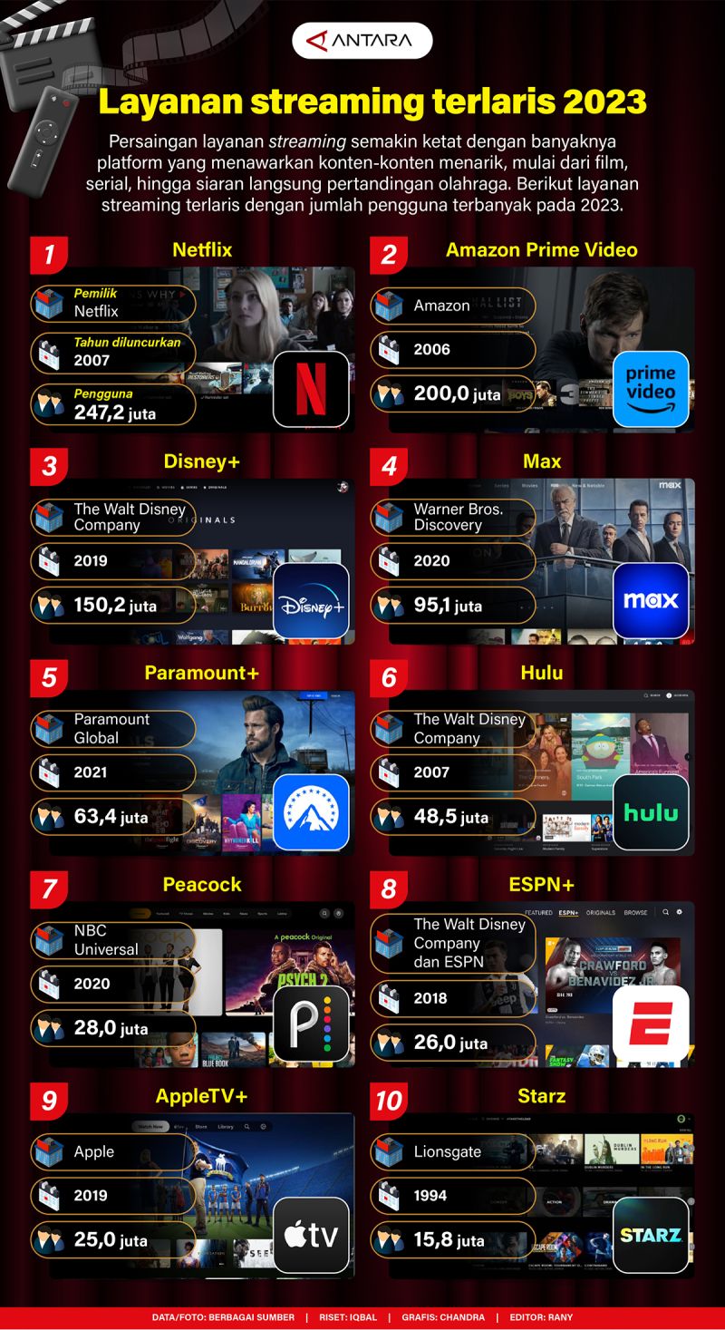 Persaingan layanan streaming semakin ketat dengan banyaknya platform yang menawarkan konten-konten menarik, mulai dari film, serial, hingga siaran langsung pertandingan olahraga. Berikut layanan streaming terlaris dengan jumlah pengguna terbanyak pada 2023.