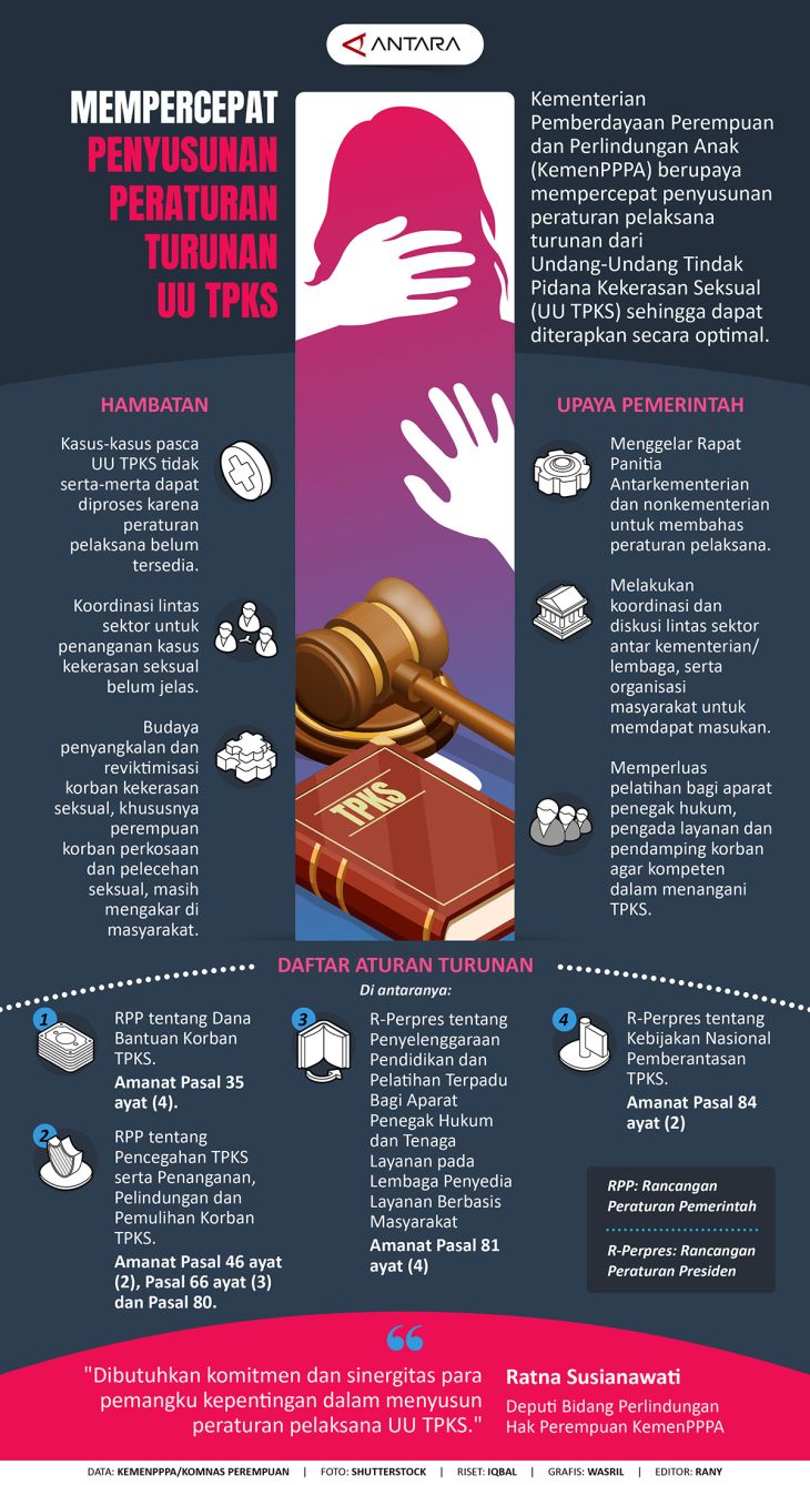 Kementerian Pemberdayaan Perempuan dan Perlindungan Anak (KemenPPPA) berupaya mempercepat penyiapan peraturan pelaksanaan turunan dari Undang-Undang Tindak Pidana Kekerasan Seksual (UU TPKS) agar dapat dilaksanakan secara maksimal.
